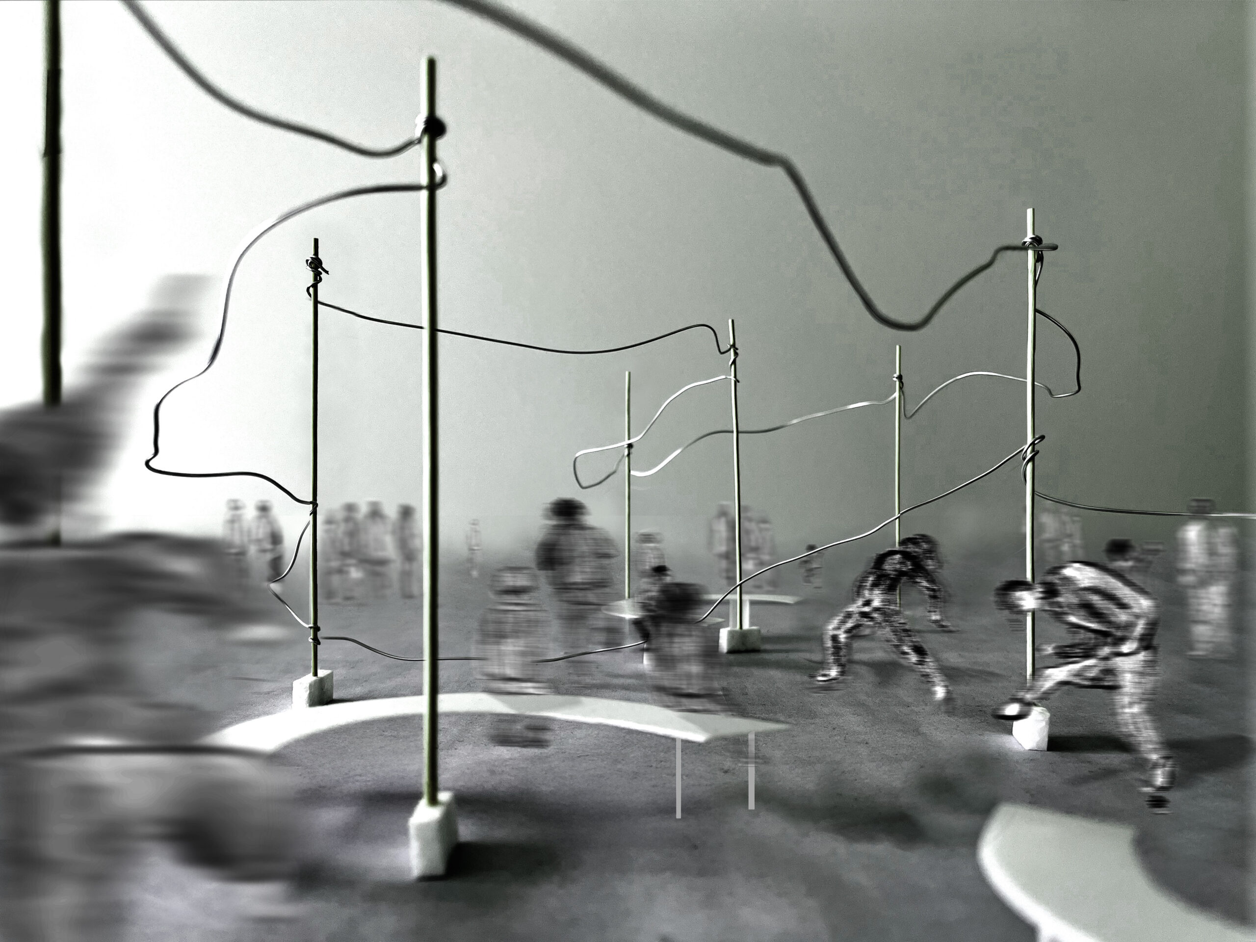 建築の集団性・身体性に着目し、即興的な仮設の構造体を展開する。領域をとじたり、ひらいたり、つないだりするような「ほどかれた結界」。これは原寸のスタディ模型でありながら、祝祭性を帯びた劇的空間でもある。